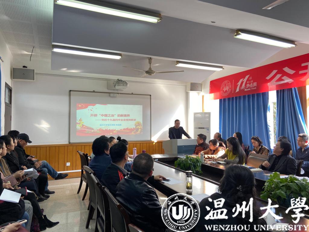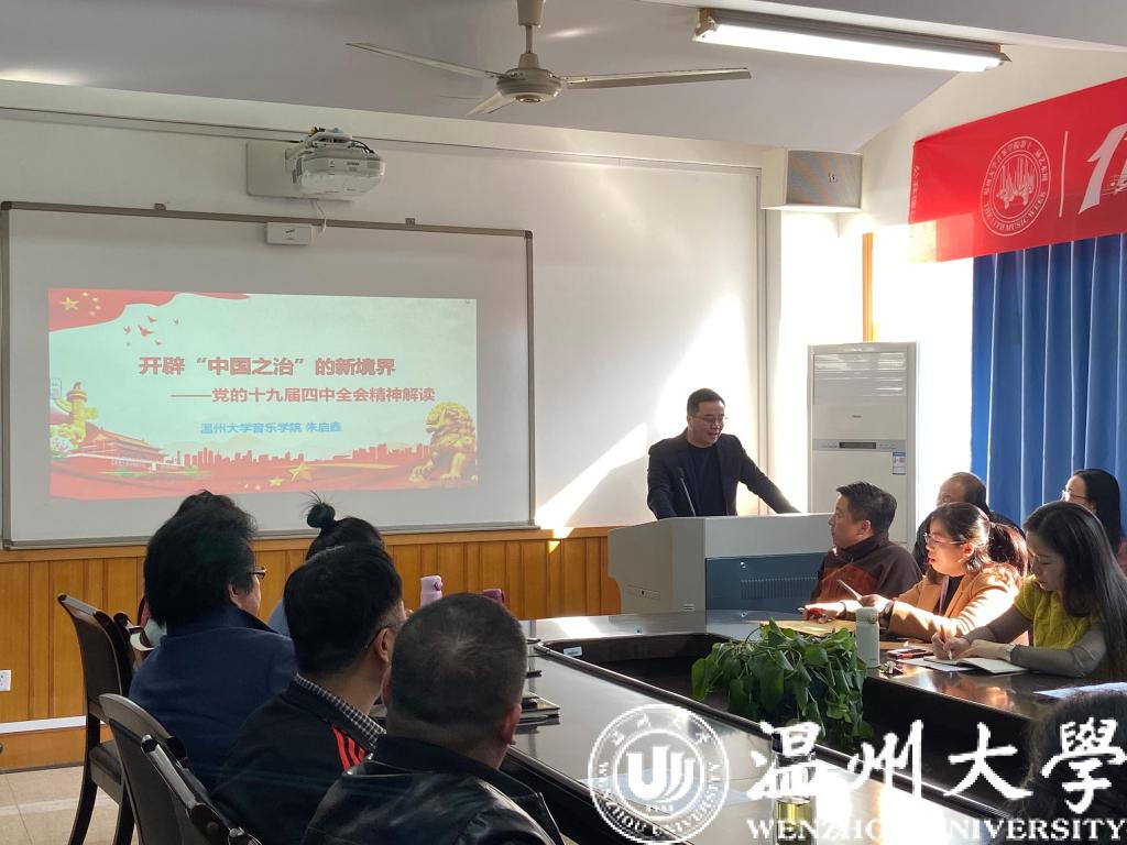 党委于音乐楼203会议室开展党的十九届四中全会精神解读,全体教职工参会,会议由学院党委书记朱启鑫主持。