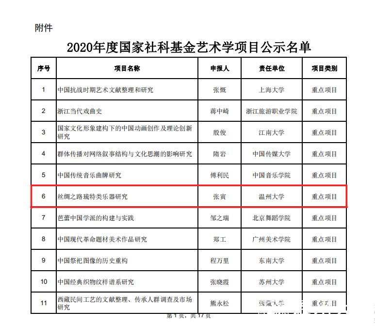 在此次立项中,我院张寅教授主持的“丝绸之路琉特类乐器研究”喜获2020年度国家社科基金艺术学重点项目,浙江省仅三所高校获得重点项目。