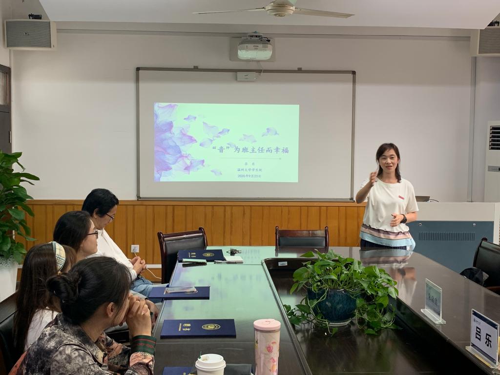 紧接着,由学工部副部长吕乐做了题为:“‘音’为班主任而幸福”的主题报告。吕部长再次指出班主任工作的重要性,班主任工作虽辛苦,但更多的是幸福,因为期间可以和学生一起获得有意义的快乐,进而探索人生的意义。随后,吕部长从“班主任知什么”、“班主任做什么”及“班主任怎么做”三方面对班主任工作进行了逐步阐释,点、线、面全方位把握学生的每个点,随时关注适应性、发展性与障碍性问题。就班主任而言,让学生养成“有困难,有我在”的理念,给予学生全身心的呵护,促进学生全面发展。