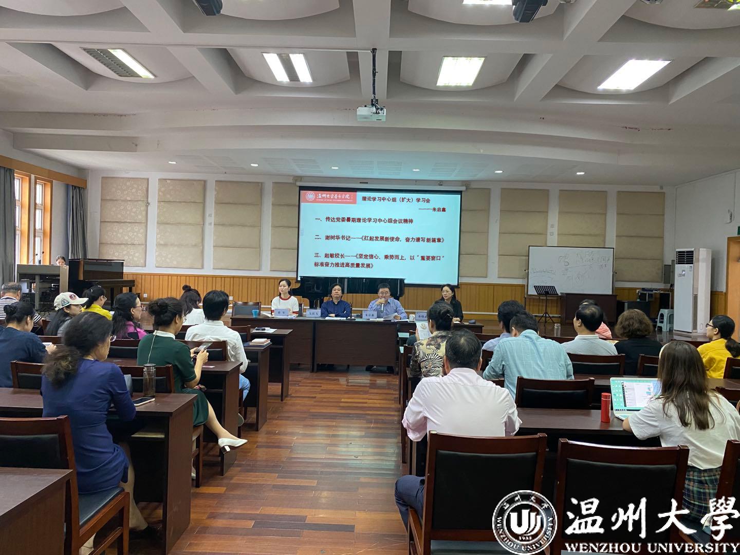 根据学校党委《关于学习贯彻全校教职工大会会议精神的通知》,院党委书记朱启鑫向全院教师传达了2020年暑期党委理论学习中心组(扩大)学习会精神,主要是学习校党委书记谢树华以及校长赵敏的重要讲话。