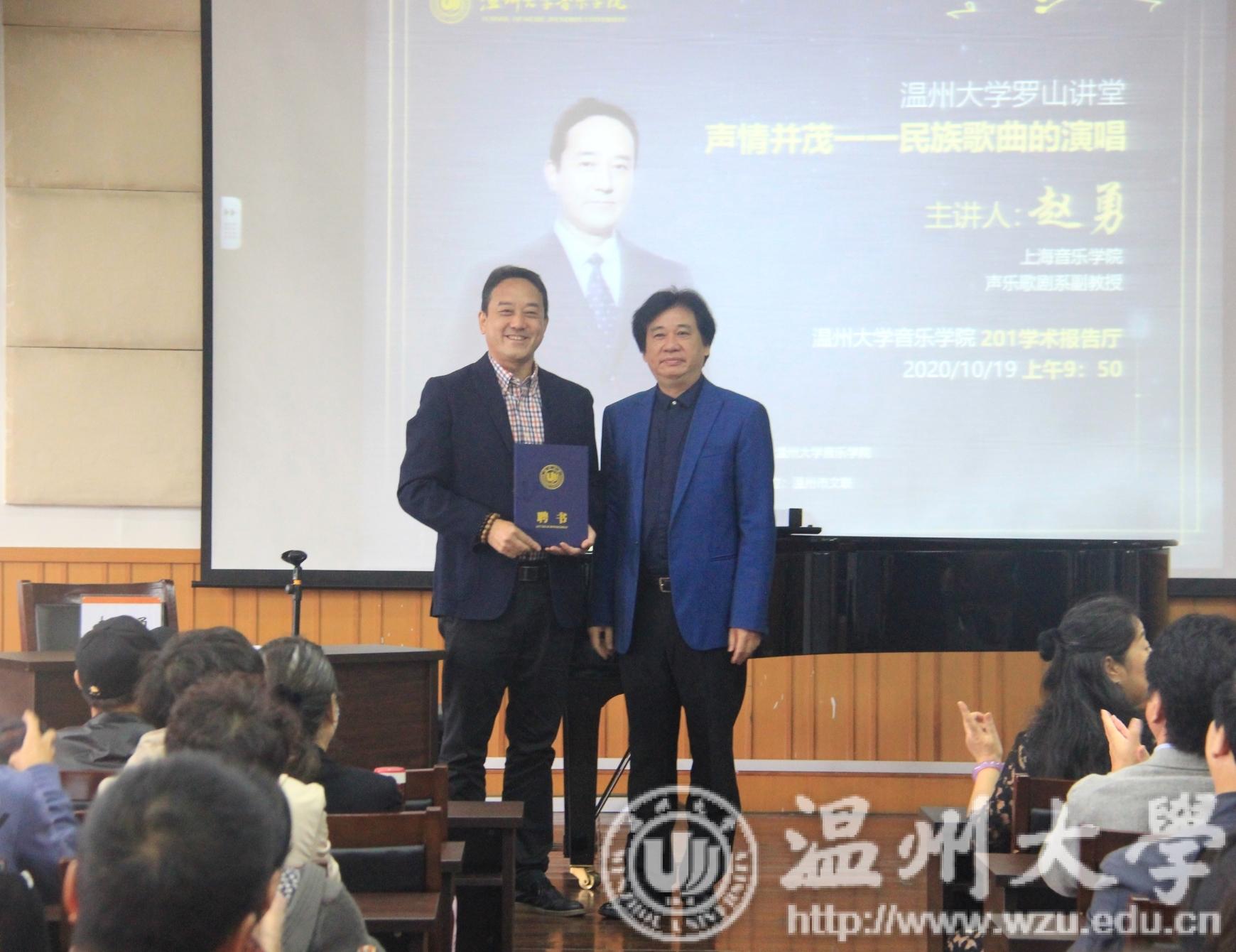 邹跃飞院长为赵勇副教授颁发了特聘教授证书。随后,赵勇教授结合了自己的家乡和亲身经历向大家介绍了不同民族的不同民歌,民歌所运用的不同技巧及自己对民歌歌词的独到的见解。赵教授身为宁夏回族人,他通过本民族的特色,演绎了几首不同地方的民歌作品,并以这些作品为例展开了他对不同作品的理解和对技巧的拿捏。其中一点是感情,他说,每个地区的民歌的风格都有所不同,在唱歌的时候不能太死板,要了解每个地区民歌的特点;另一点是在声音方面要讲究歌唱的感觉以及歌曲的表达方式,还有就是字头字中字尾的韵母要咬清楚。同时也传达了艺术指导的重要性,使台下的观众赞不绝口赢得了满堂喝彩。随后,此次参加青歌赛的三位优秀选手上台一一展示了自己准备的作品。赵勇教授无论从技巧、唱法、表情管理等方面提出了十分细致、中肯、准确的建议。