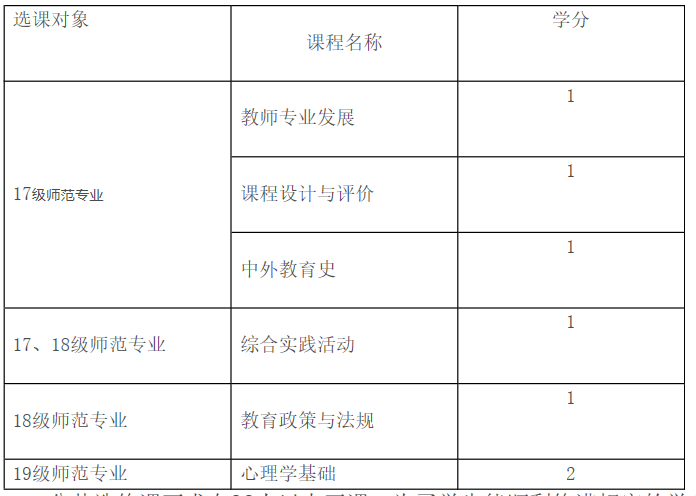 师范类专业本科人才培养方案,要求学生对教师教育类公共选修课必须修满6学分。根据培养方案课程设置,2019-2020-2学期开设的教师教育类公共选修课如下附表: