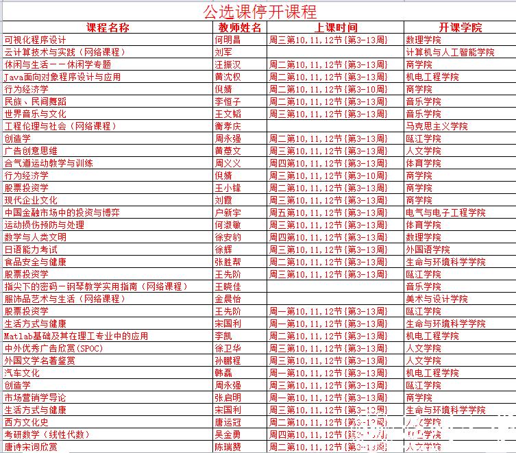 停开课程列表: