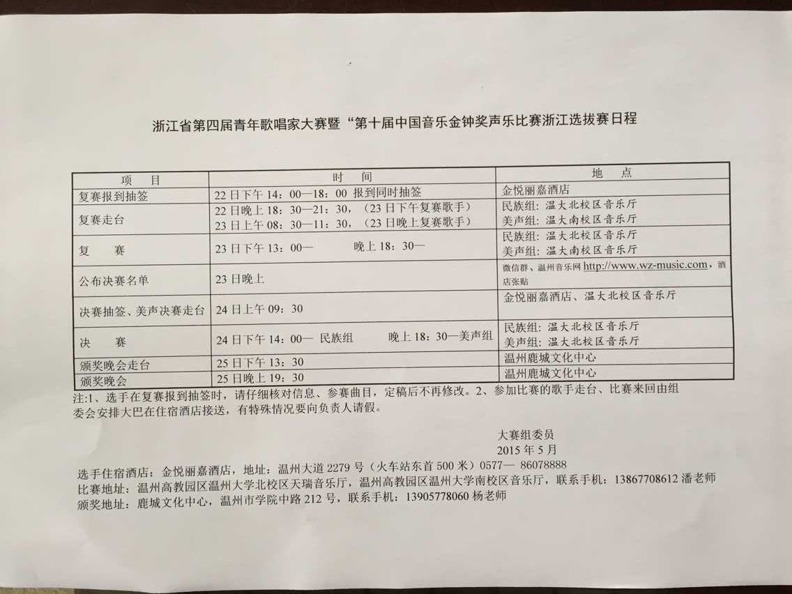 浙江省第四届青年歌唱家大赛暨“第十届中国音乐金钟奖声乐比赛”浙江选拔赛日程