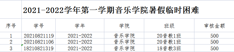 2021-2022学年第一学期音乐学院暑假临时困难补助申请结果予以公示。