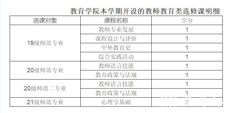 师范类专业本科人才培养方案要求,师范生需修读教师教育类选修课,19级、20级、21级学生需修满3学分(具体以各自专业的培养方案为准)。该类课程设置分为教育学院面向全校师范专业统一选课开设及学生所在学院专业内独立选课开设两类。现开展教育学院面向师范专业开设教师教育类选修课选课工作,具体如下: