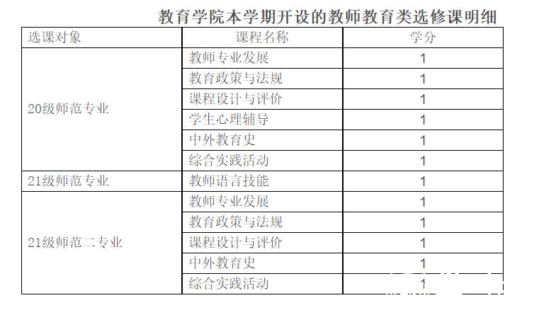 师范类专业本科人才培养方案要求,师范生需修读教师教育类选修课,20级、21级学生需修满3学分(具体以各自专业的培养方案为准)。该类课程设置分为教育学院面向全校师范专业统一选课开设及学生所在学院专业内独立选课开设两类。现开展教育学院面向师范专业开设教师教育类选修课选课工作,具体如下: