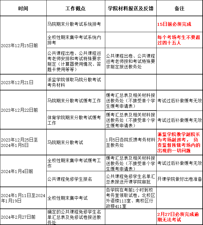 根据学校安排本学期教学时间到2024年1月19日结束,为做好本学期期末考试工作,现将有关事项通知如下: