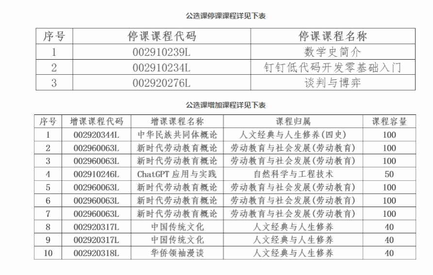 2.因涉及部分通选课停课/增课,请同学务必登记系统查看个人课表,及时进行补选,确定各自全校性通识教育选修课程上课时间和地点并准时上课;开课课程为混合式课程(spoc课程)的,请及时任课老师或学院教学科老师联系确认在线授课平台。