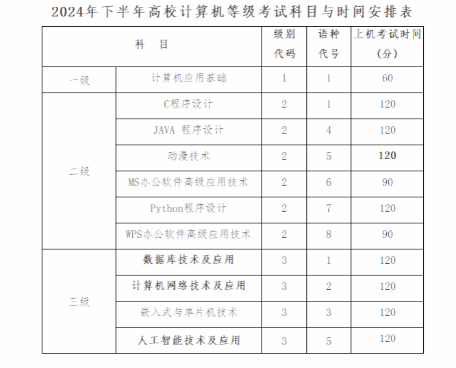 (六)三级:考试时间为120分钟。共有数据库技术及应用、计算机网络技术及应用、嵌入式与单片机技术、人工智能技术及应用四个科目,题型均为判断题(10%)、单选题(60%)和综合应用题(30%)。