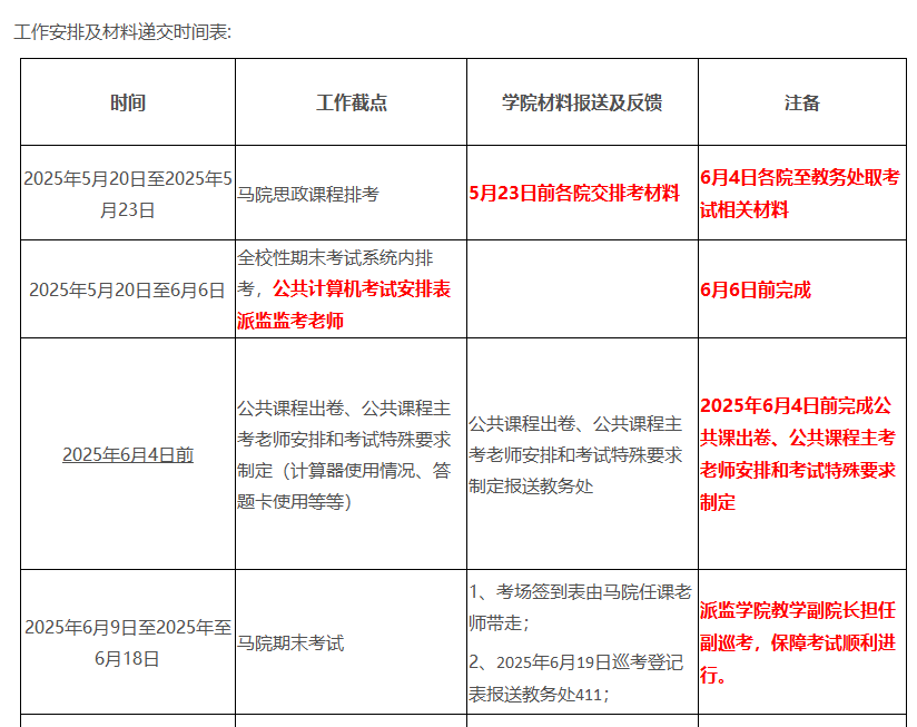 1.2025年5月20日至2025年5月23日16:30前,各学院填写马院期末考试安排总表和学院学生具体考试时间地点安排表(《马克思主义基本原理概论》、《毛泽东思想与中国特色社会主义理论体系概论》、《习近平新时代中国特色社会主义思想概论》、《思想道德与法治》、《中国近现代史纲要》(拟定于第16周至17周周三期间考试),考前教务处统筹调整后发布信息。