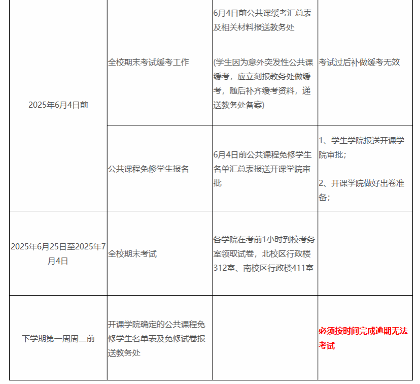 3.期末考试的公共课程缓考申请汇总材料最迟请于2025年6月4日前送至南校区行政楼411办公室。专业课程考试缓考由开课学院在该门课程开考前自行录入系统。