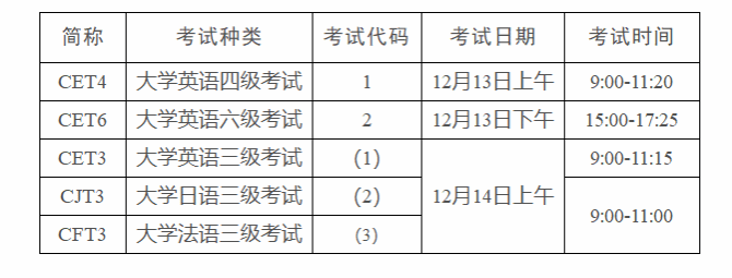 全国大学英语四、六级考试笔试(以下简称CET)考试时间为12月13日,开考科目为英语的四级、六级。